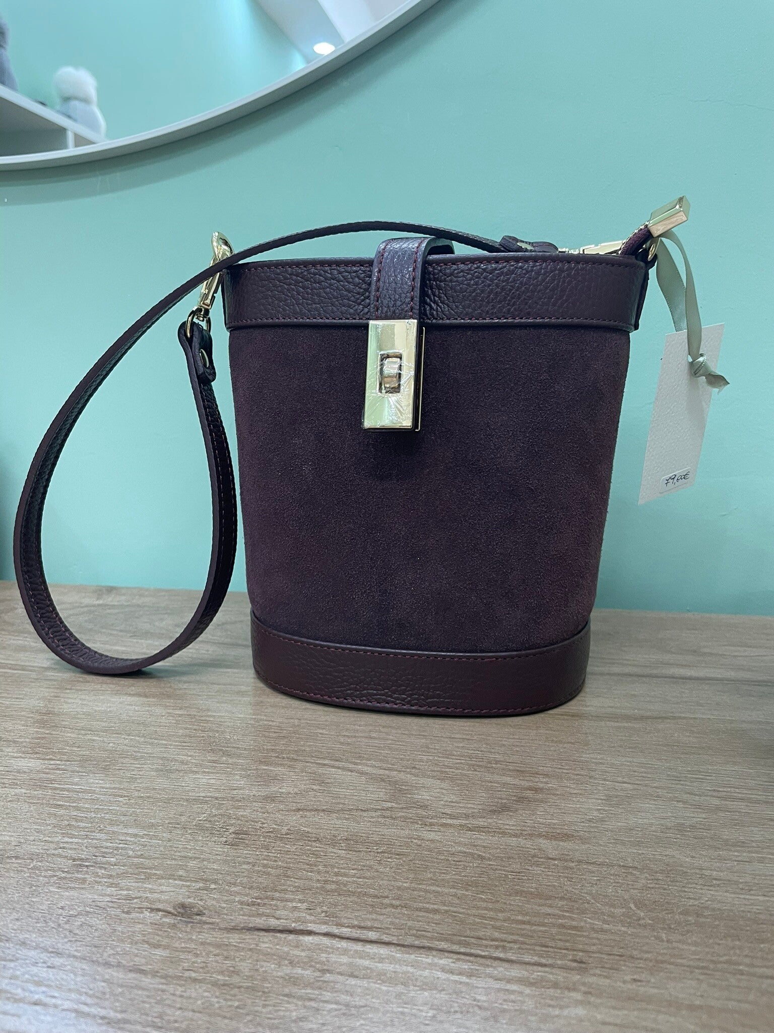 Realizzata in camoscio con profili e base in pelle liscia. Dotata di tracolla regolabile. Disponibile in tortora e bordeaux.